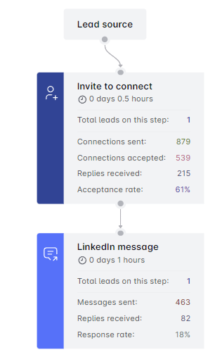 Scroll down for a detailed breakdown of each campaign step. See how many connections were sent, replies received, and emails/messages dispatched by Linked Crush. It varies based on your campaign type and the steps included. Easily spot where your leads stand in the campaign.